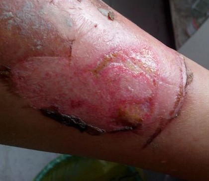 我是12月24号晚上被开水烫伤的,现在都1月16号了,也没好,第一张照片是1月8号拍的,我被烫后,我都在医院包扎,用的药是硝酸银软膏和复方桐叶烧伤油。都是在医院换药,可是今天换药医生告诉我伤口发炎,有脓肿现象。这都快20天了,这烫伤还没愈合,很是焦急。